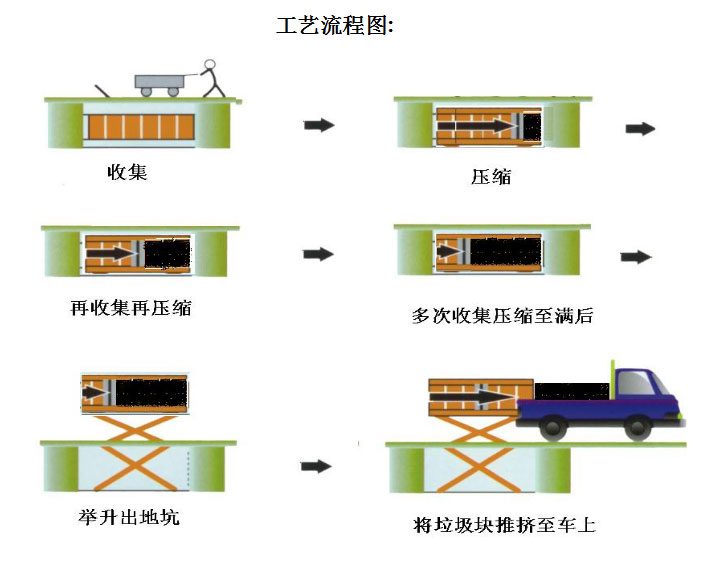 1.主要特點 ◇平穩可靠:兩側舉升,剪叉跨度大,升降平穩,無傾斜; ◇淺地坑:地坑深度僅為1.55m,保潔及維修極為方便; ◇高效率:壓實每噸垃圾時間≤10min; ◇全封閉水平壓縮:采用水平壓縮方式,垃圾壓縮密度≥0.86t/m3,垃圾壓縮后體積大大減小,從而大幅度提高轉運車輛裝載量和轉運效率,降低垃圾處理、轉運等費用; ◇動作少,故障率低,整套設備的垃圾壓縮、裝車由三個動作完成,簡單實用,各動作之間安全互鎖,防止操作人員誤操作造成安全事故,安全可靠; ◇垃圾儲存、壓縮及寄存全部在地面以下,地面上沒有垃圾散落,對環境影響較小,環保性好;垃圾壓縮后密度高,水份少,可避免汽車運輸中的垃圾散落、污水滴漏現象,避免二次污染; ◇土建費用低,占地面積小,可以不蓋大型工作間,既節約了投資,也縮短了工期; ◇留有專門的維修窗口,維修保養方便; ◇設有固定式操作和遙控器兩種操作模式,方便實用; ◇自動化程度高,可大幅提高工作效率,降低勞動強度。![]()